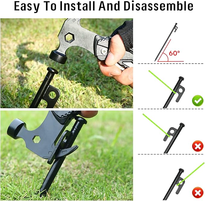 - 【Easy to use】With a large flat head and sharp point, it's easy to drive the stake into the hard ground with a hammer. TIPS: Set the tent peg and ground at a 60-degree angle, leaving about 1.6 inches (4 cm) free to allow enough room to tension the rope.