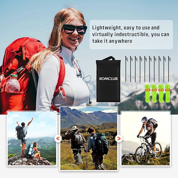 KOMCLUB 10PCS Tent Stakes Heavy Duty Tent Pegs Metal Tent Pegs Canopy Stakes Ground Stakes Spike Steaks for Outdoor Camping Tents Garden Canopies Grassland with Storage Bag and Reflective Guy Lines