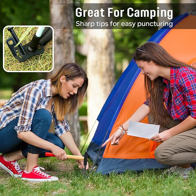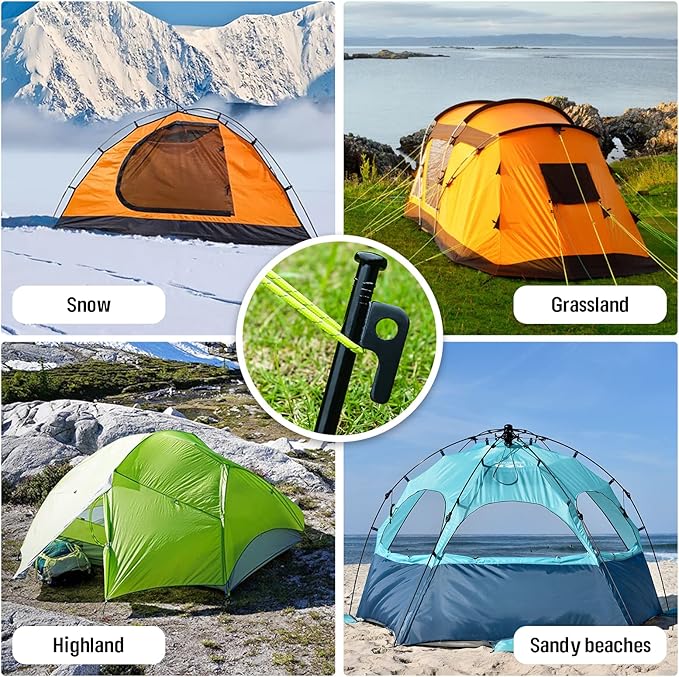 - 【Wide recognition】heavy-duty tent pegs hold up in dirt, sand, grass and rocky ground in high winds. An indispensable tool for securing tents, tarps, canopies, picnic mats, sun shades, etc.