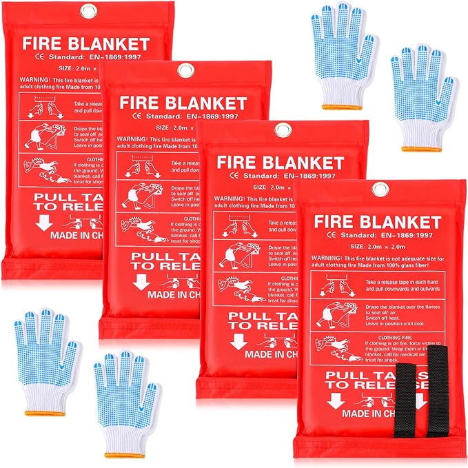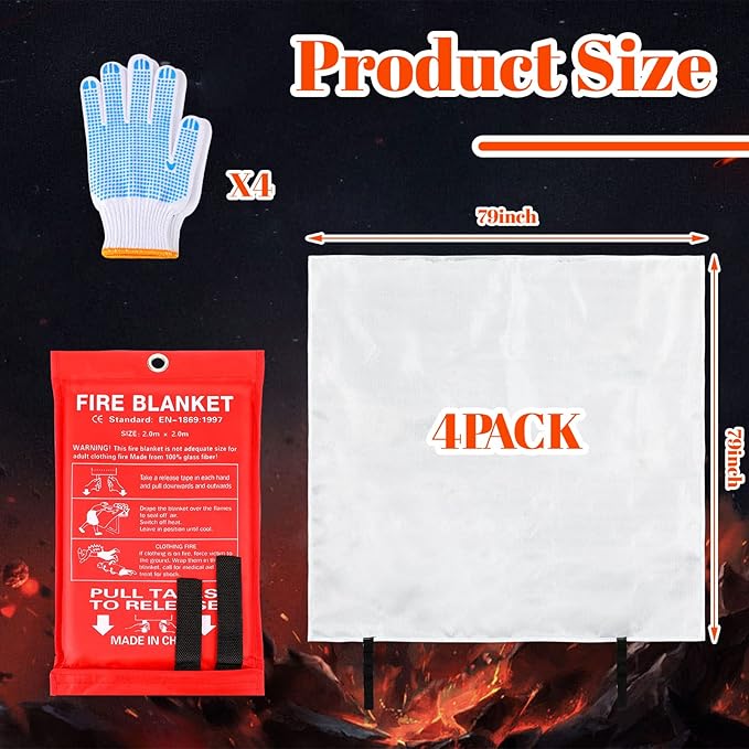 - Package Included: you will get 4 pieces of 79 x 79 inches fire blanket and 4 pairs of gloves, they can easily be stored in kitchen counters in case of emergency, recommend keeping one nearby kitchen, fireplace, grill, car, office, camping and so on