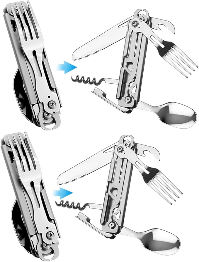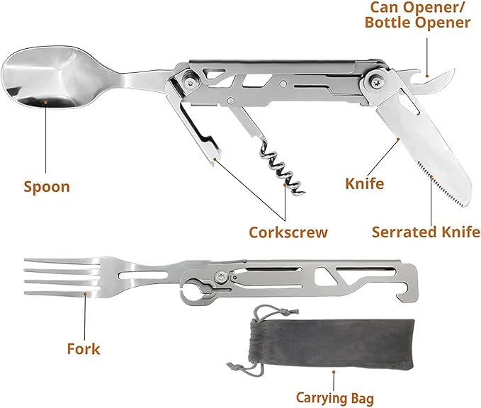 - ✔5-in-1 Folding Multifunctional Cutlery: Contains knife, fork, spoon, wine corkscrew and can opener corkscrew. Outdoor camping portable multi-function cutlery set can save space and it’s great to bring for camping, travel, office, college school, car, backpacking trip, picnic, hiking and more.