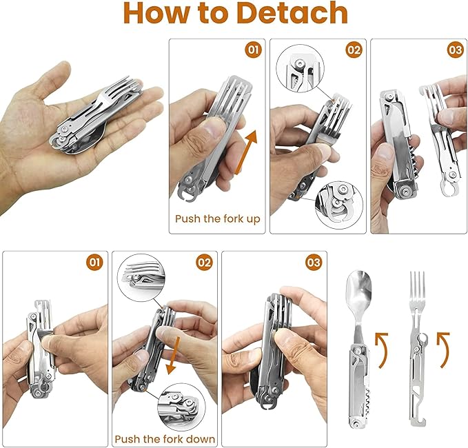 - ✔Innovative Detachable Design: The fork part of this portable pocket utensil set is can be disassembled and used separately. After you use it, it can be folded and installed to the multi-function tool, or it can be directly opened and used without disassembling. The spoon and Knife is not detachable.