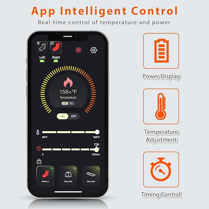 - 🔥APP Intelligent Control: MATKAO heated socks come with an exclusive APP. You can scan the QR code in the instruction manual or search for Q-thermo in the app store to download the app, which can accurately adjust the temperature, timing function and real-time power display. The temperature can be adjusted to any comfortable temperature from 86°F to 158°F; no need to bend over to find the switch in winter, allowing you to better enjoy the warmth brought by the heated socks.