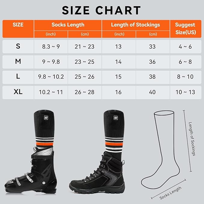 - 🔥Perfect Gift for Winter Activities: The rechargeable heated socks are suitable for various outdoor activities in winter, such as camping, hunting, hiking, skating, fishing, motorcycle, cycling, outdoor work, etc. Heated socks bring warmth to your loved ones, parents and friends. They are the perfect warm gifts for Thanksgiving, Christmas and Valentine's Day. Heated socks can also be used as Christmas stocking fillers!