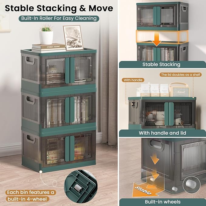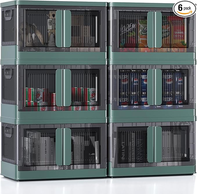 8.4Gal Collapsible Storage Bins with Lids & Wheels - 6 Pack Stackable with Doors, Heavy-Duty Plastic Containers for Home/Office, Green