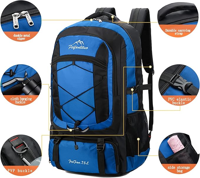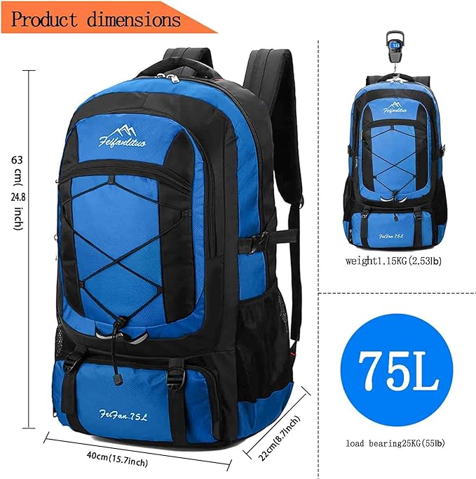 - Large Capacity: 75L extra large capacity camping backpack, one main zippered compartment, 3 zippered front pockets, two side straps, multiple hanging buckles. Backpack size 24.8*15.7*8.7 inches (63*40*22cm), the carrying capacity of the backpack is 20-25KG, Can accommodate laptops, cameras, hiking crutches, tents, books, clothes, shoes, water glasses, umbrellas and other daily necessities.you can take this mountaineering backpack to travel, mountaineering, hiking, camping, fishing, etc.