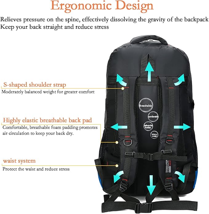 - Ergonomic Design: This Mountaineering Bag is ergonomically designed with mesh on the shoulder straps and back which is very breathable. The built-in foam pad is shock-resistant and decompressed, as well as the chest strap and waist belt design, which can make the backpack fit firmly on our back, distribute the weight evenly, and reduce the pressure on the shoulders,super practical and large capacity hiking backpack.