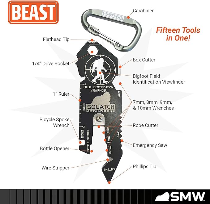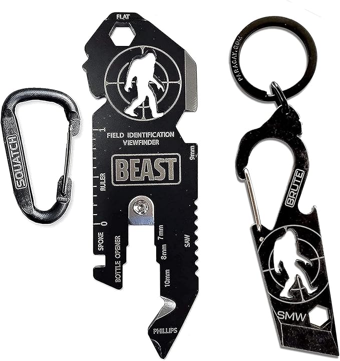 BEAST & BRUTE Combo Pack - Multi-Tool & Bottle Opener, Bigfoot gift for fans of Sasquatch, Yeti, Camping, Hiking - With Screwdriver, Wrench, Carabiner, Box Opener, 1/4" Drive