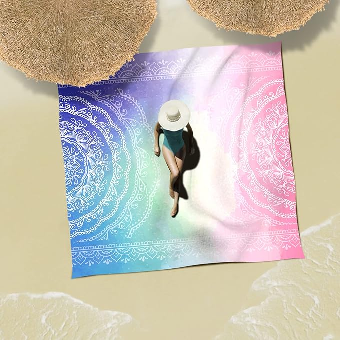 Sunlit 10'x9' Extra Large Boho Sand Proof Beach Blanket, Sand Proof Mat with Corner Pockets and Mesh Bag for Beach Party, Travel, Camping and Outdoor Music Festival, Blue and Pink Mandala