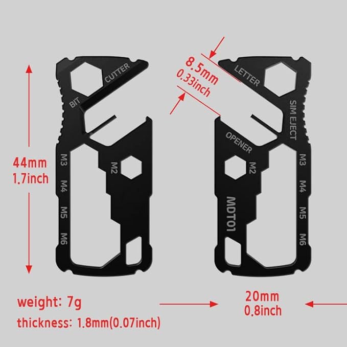 - 🛠️【All in One Tool】 The multitool, MDT001 is designed by MADD. 15 in 1, includes keychian, slotted screwdriver, various hexagon wrenche, 1/4 bit holder, box cutter, and simcard ejector.