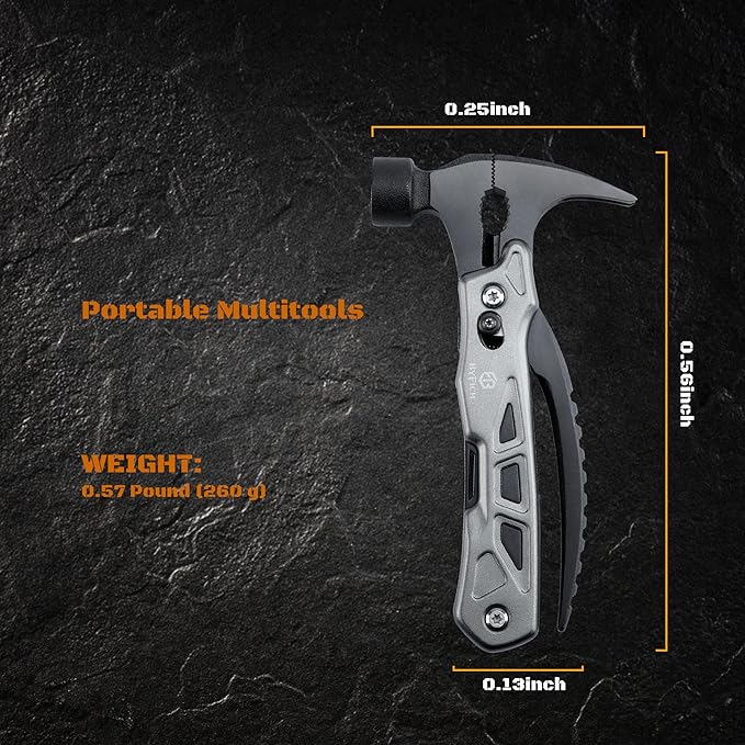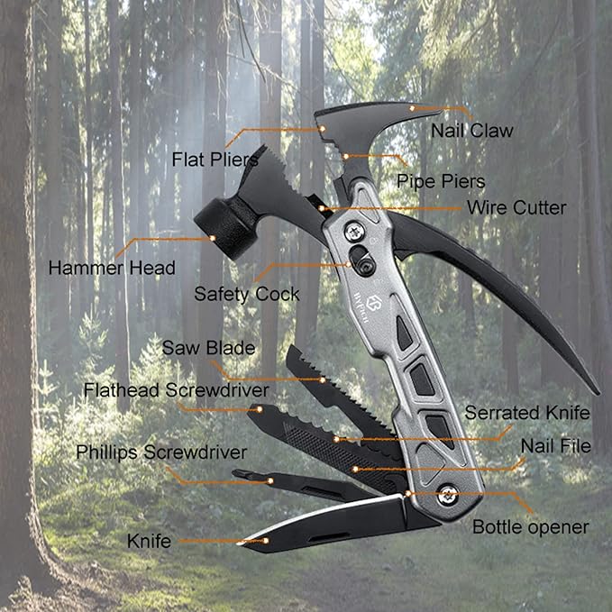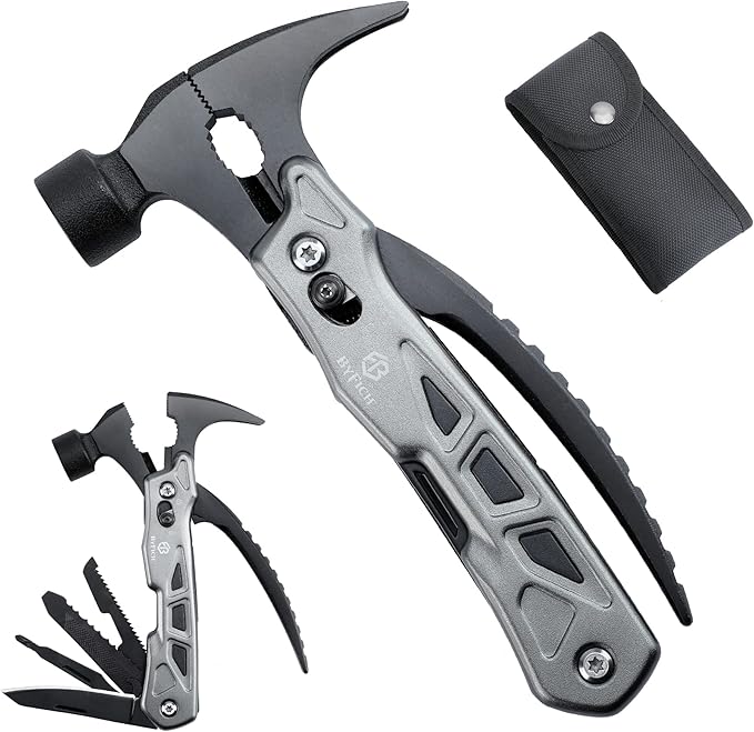 - 12-IN-1 TOOL - Our BYFICH multi tool hammer features many handy instruments including a hammer, pliers, serrated knife, saw, wire cutter, prying claw, nail file, bottle opener, flat and phillips head screwdrivers.
