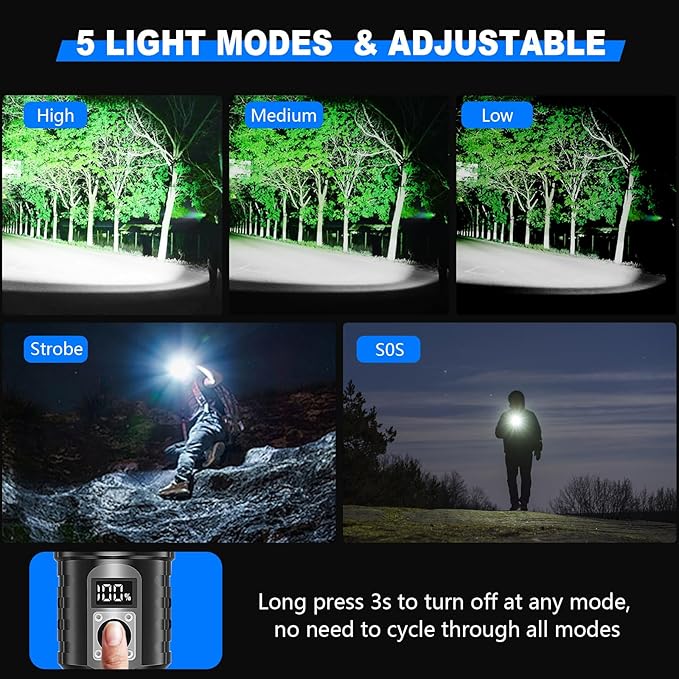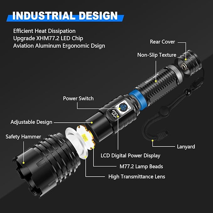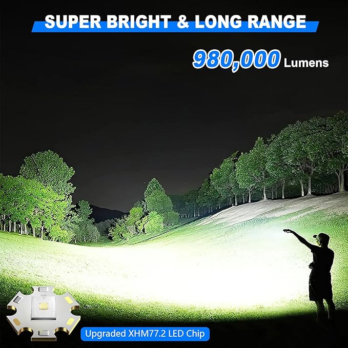 - 【FLASHLIGHTS HIGH LUMENS 980,000】: The super bright flashlight is equipped with an upgraded 2024 XHM77.2 chip and the light source is much more stable. Since the light penetration is stronger than other lamp beads', its beam can pass through dust and fog well, comparable to car fog lamps, especially suitable for foggy and rainy days with low visibility. It can easily illuminate an 2160-square-foot room or focus on objects up to 3938 feet away.The led flashlight is the best choice for gifts.