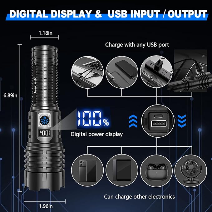 - 【LCD POWER DISPLAY | RECHARGEABLE FLASHLIGHTS | USB OUTPUT】: This flashlights high lumens Rechargeable has been newly upgraded with the unique LCD power percentage display, at a glance, you can always grasp the remaining power. As well, this flash light has been completely improved to shorten the charging time and extend the service life, which can provide up to 12 hours of powerful, non-diminishing brightness. Built-in usb interface, It's more convenient to charge. It can also charge the phone.