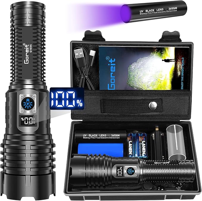 - 【UPGRADED GREAT VALUE POWERFUL FLASHLIGHTS KIT】: What you will get : 1x Goreit G1695 high powered flashlight, 1x UV blacklight flashlight, 1x Powerful battery and USB charging cable, 3x AAA Batteries, 1x Lanyard and holster, 1x Manual and Gift box. You will be pleasantly surprised by the brightness, quality, longevity and performance of the led flashlights high lumens.If you have any questions about the led flashlight, please feel free to contact us. We will be happy to answer your questions.