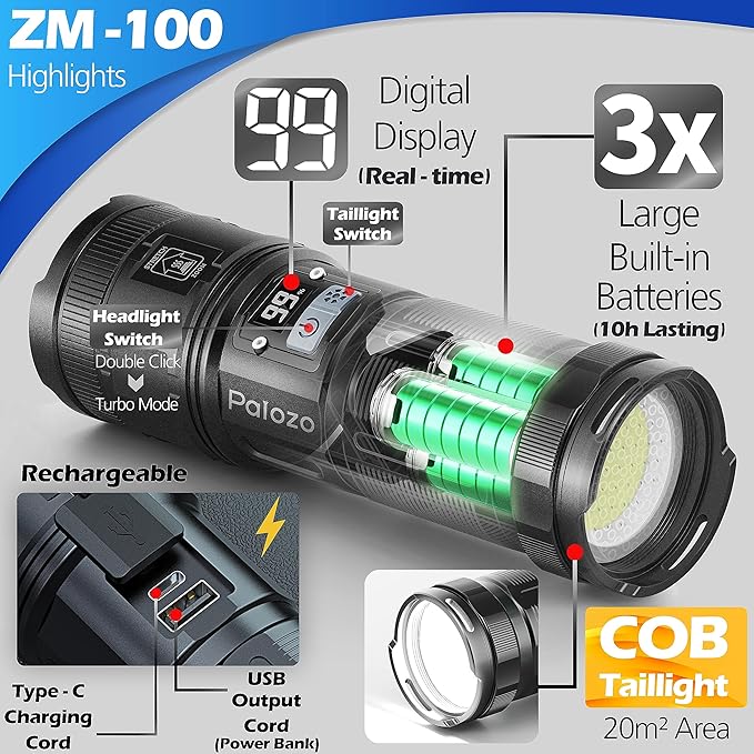 - [ Digital Real-time Display ]: ZM-100 rechargeable flashlight is equipped with a digital real-time display, providing you with precise numerical information to ensure that you never lose your way in the darkness. With this feature, you can confidently navigate your surroundings, secure in the knowledge that you have a reliable and accurate source of illumination at your fingertips.