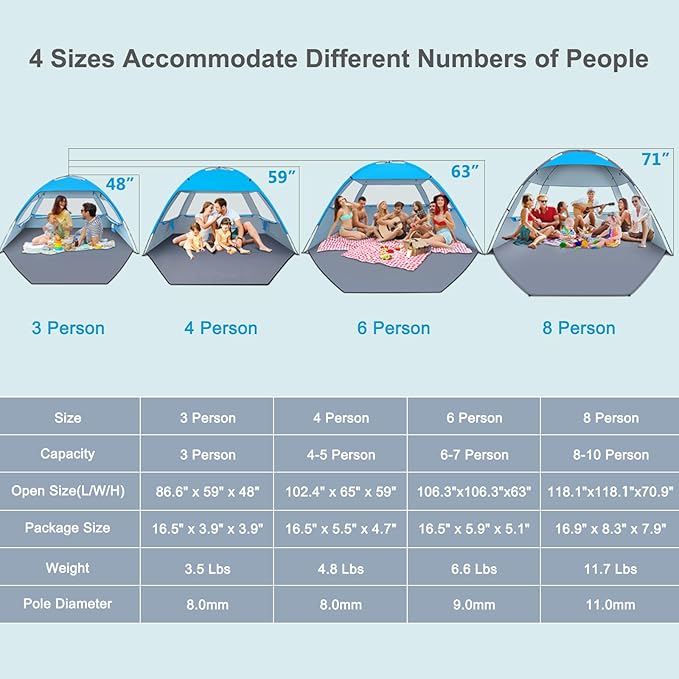 - Super Large Space: Size of 118"L x 118"W x 71"H, 30% bigger than other instant tents at a similar price, fits 8-10 people. It provides a comfortable space for family and friends on the beach