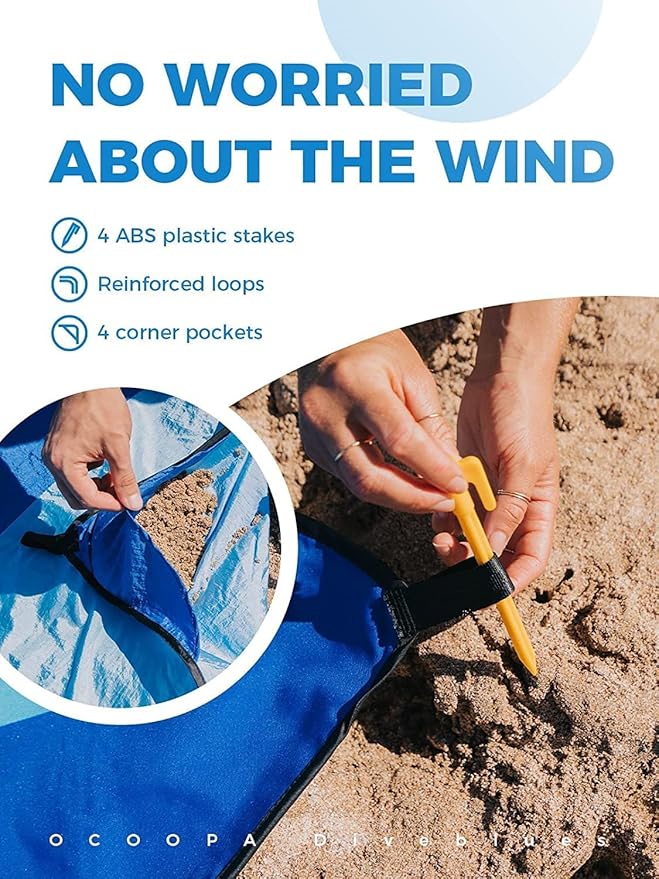 - 🎊 Everything You Need in One Package. Our blanket comes with 4 ABS Plastic stakes and reinforced anchor loops, as well as 4 corner sand pockets to keep it grounded on windy days. Plus, it comes with a carrying bag for easy storage and transport.
