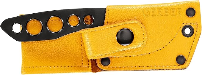 - QUALITY CRAFTED: Features a stainless steel, plain edge fixed blade and clip point, stain resistant PVD coating, skeletal grip handle, paracord holes, lanyard hole, and leather sheath