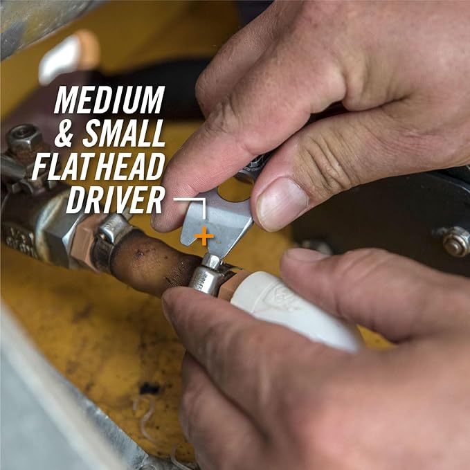 - 6-IN-1 MULTI-TOOL: Features pry bar, wire stripper, nail puller, small flathead driver, large flathead driver, bottle opener, pocket clip, and key ring lanyard