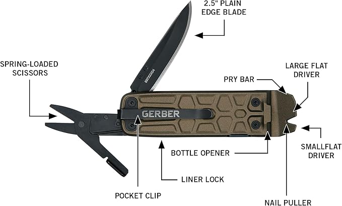 Gerber Gear Lockdown Slim Pry 7-in-1 Multi-tool - 2.5" Plain Edge Blade, Scissors, Saw - EDC Gear and Equipment - Burnt Bronze