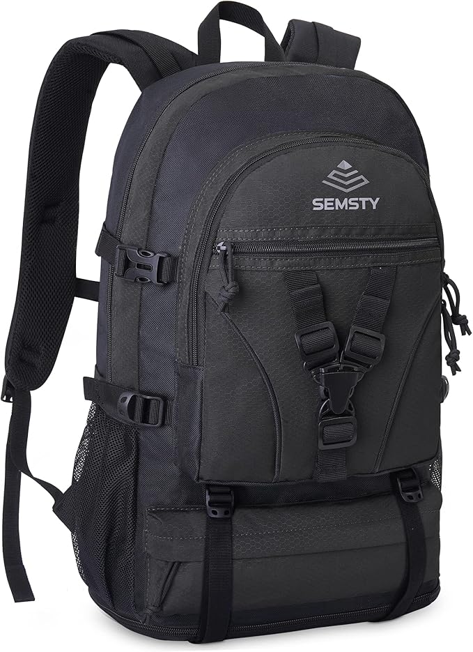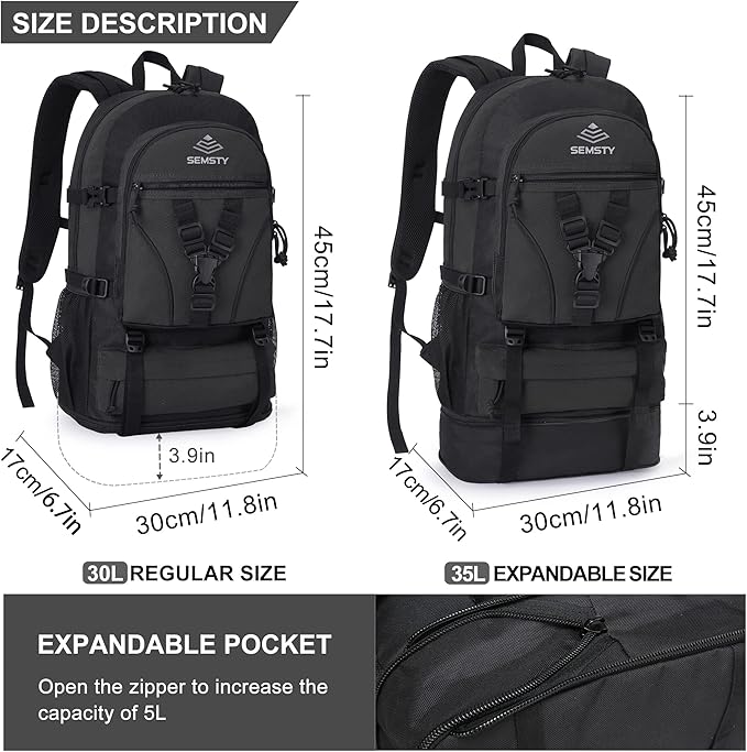 - Expandable & Extra Large Capacity: This hiking daypack can be expanded by using the zipper at the bottom(from 30l to 35l). Roomy enough for a CARRY ON. The side buckles makes your stuffs safe and makes the backpack not too bugling even it's fully packed. Multi-compartments help you organize all your essentials like clothes, camping supplies, gears, etc. Perfect for outdoor activities