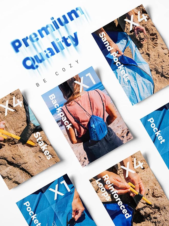 - 🎊 Everything You Need in One Package. Our blanket comes with 4 ABS Plastic stakes and reinforced anchor loops, as well as 4 corner sand pockets to keep it grounded on windy days. Plus, it comes with a carrying bag for easy storage and transport.