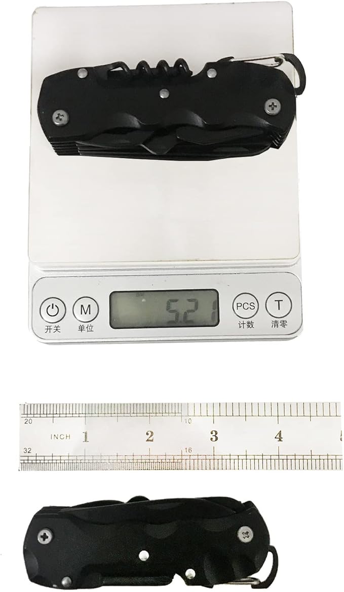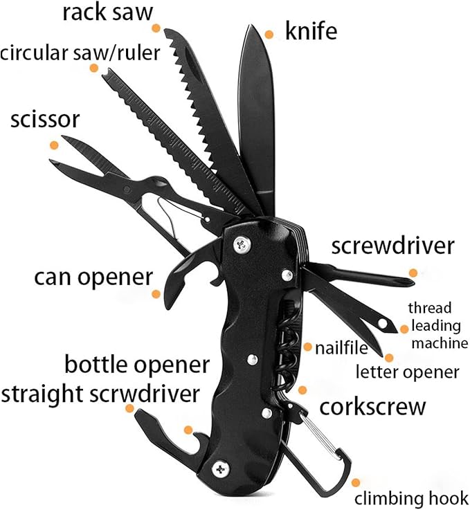 - 1.15-in-1 multi-function tool includes a knife, rack saw,circular saw,ruler,scissor,can opener,bottle opener,straight scrwdriver,climbing hook,corkscrew,letter opener,nailfile,screwdriver,thread leading machine.