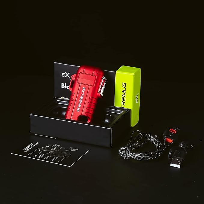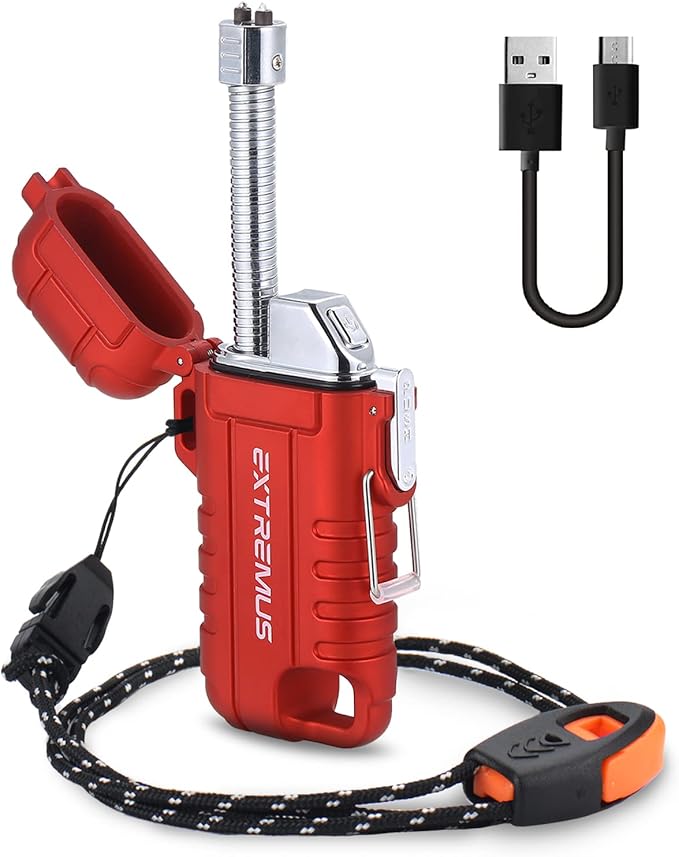 Extremus Blaze 360 Rechargeable Electric Lighters, Dual Arc Lighter, Windproof Plasma Lighter, Waterproof Lighter, Flameless Lighter with Whistle Lanyard for Camping (Red Flex)