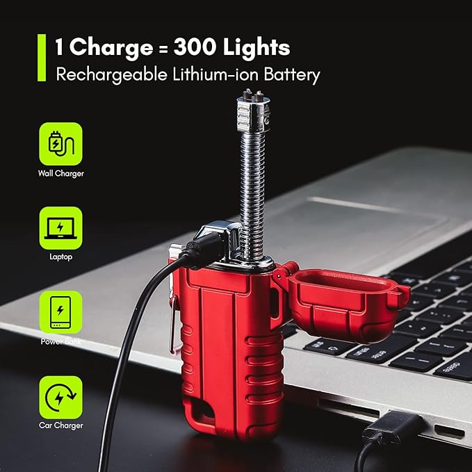 - USB-C Rechargeable Lighter: This electronic lighter contains a rechargeable lithium-ion battery that offers 300 uses per charge. With a Type C charging port, the lighter charges conveniently on your laptop, power bank, car charger within 5V.