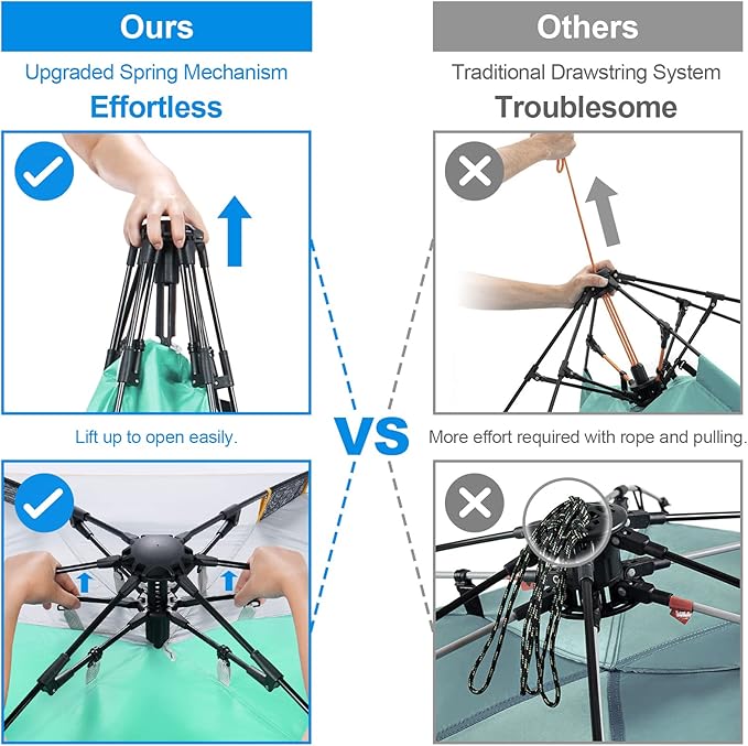 - Easy Setup & Super Stable: The specially designed spring opening system shows an industry-leading level of improvement. One person can set up the beach canopy easily in seconds. Compared to the drawstring design, this one is faster, effortless, and saves more time.
