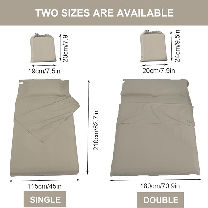 - PORTABLE TO CARRY:This lightweight and compact sleeping sack sheets is foldable, and the size after folding is 20x24cm (7.9x9.5"), only 2 lb (930g). Comes with a storage bag.You can storage it in your backpack. It will be your great travel and camping companion.