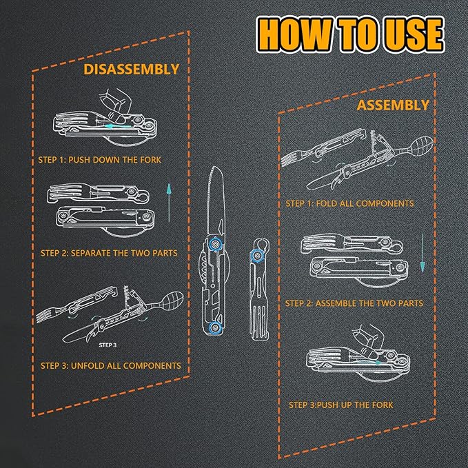 - ✔️【FOLDING CAMPING CUTLERY】UMEINAC TECH camping fork can be taken apart from the camping fork spoon knife set which will become a separate tool. No need to waste money on a wide range of single travel knife sets or accessories. As travel utensils can meet any need in camping, picnic, hiking, backpacking, travel.