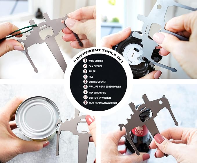 - 9 HANDY GADGETS: Complete tasks around the base using this pocket tool. The 9 functions include a wire cutter, can opener, ruler, file, bottle opener, Phillips head screwdriver, hex wrenches, butterfly wrench, and flathead screwdriver.