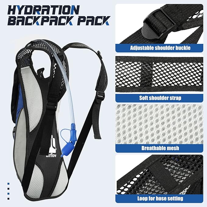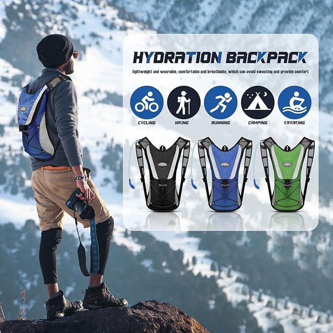 - Compact and Lightweight: hydration backpack pack with 2L water bladder are compact and portable, lightweight for many outdoor activities, such as running, road biking, camping and ultralight hiking; They are humanized designs for back fit and filling water to the body timely