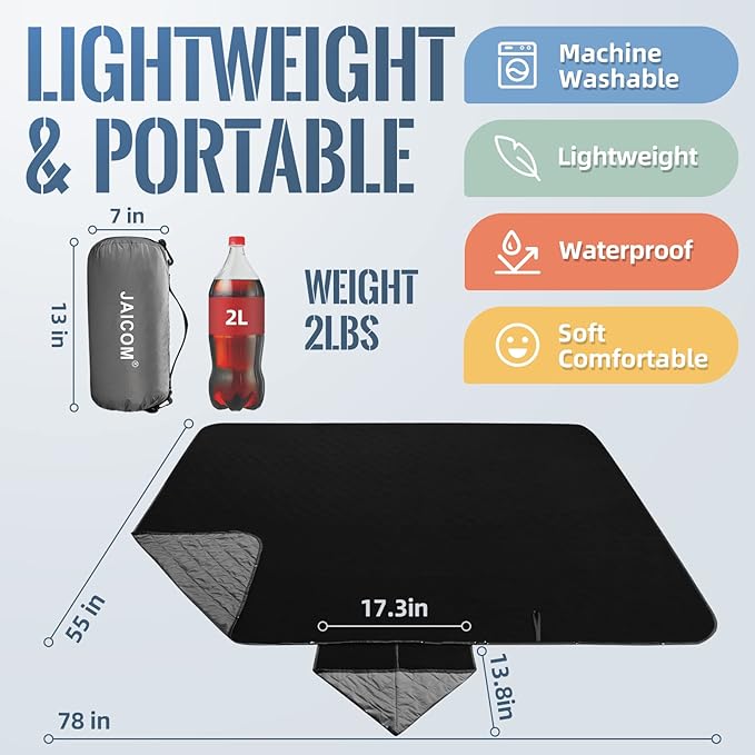 - SIZE & WEIGHT: Our outdoor blanket is generously sized at 79" x 55" (Equivalent to a Queen Size Mattress), making it perfect for comfortably accommodating two adults. Despite its large size, the blanket is incredibly lightweight at just 1.98lbs and can be easily carried in its compact 13" x 7" package. The package also features a convenient shoulder strap design that allows you to carry the blanket hands-free