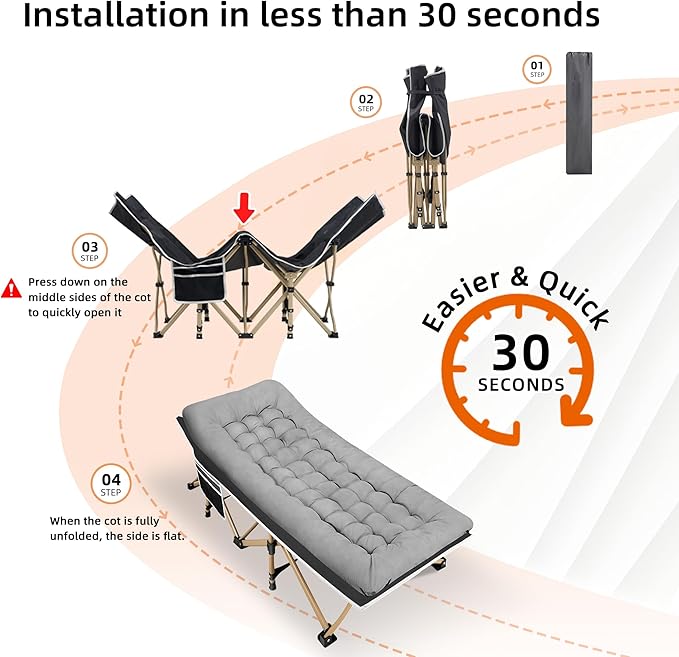 - 【How to Open the Camp Cot】Pls follow the picture 4 to open the cot: first, release the belt buckle, and then press down on the middle part on both sides (in the direction of the arrow) to fully unfold the camping cot.