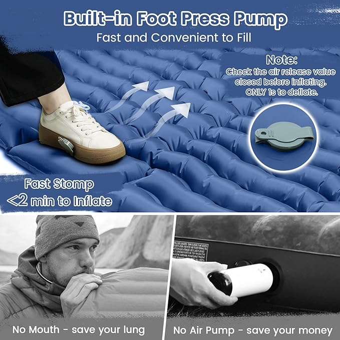 - 🎁【Fast Foot Pump to Inflate & 1s Deflation】This camping pad owns an innovative built-in foot pump that you’re able to stomp on it at the bottom of the sleeping pad for less than 2-minute to inflate. On the contrast, open the 2 deflation plugs and only need 1 sec to deflate quickly. With the upgraded design, you shall never worry about air leaking and get a comfortable whole-night sleep.