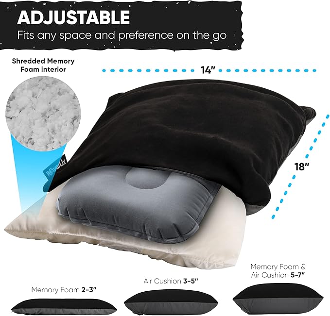 - NEW UPGRADE - more durable and versatile! Made with both self-inflatable core and memory foam, our pillow is ergonomically designed for comfortable sleeping. Its memory foam helps relief from muscle fatigue, neck and back pain, support head and neck for better spine alignment and breathing. The inflatable core is adjusted easily to your favorite height within 3-5 breaths. Highly durable elastic TPU fabric ensures the air remains full overnight. No more stiff or sore neck. Sleep just like home.