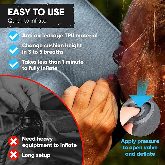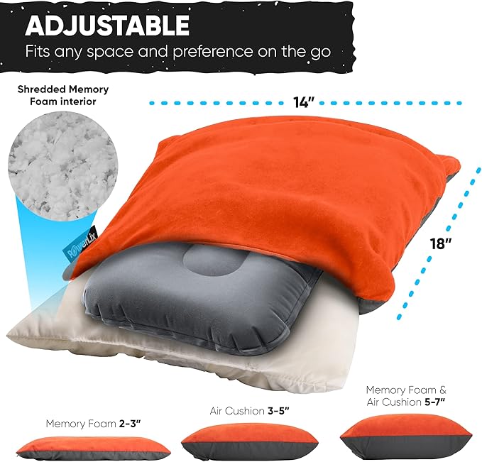 - NEW UPGRADE - more durable and versatile! Made with both self-inflatable core and memory foam, our travel pillow is ergonomically designed for comfortable sleeping. Its memory foam helps relieve muscle fatigue, neck and back pain, support head and neck for better spine alignment and breathing. The inflatable pillow is adjusted easily to your favorite height within 3-5 breaths. Durable elastic TPU fabric ensures the air remains full overnight. No more stiff or sore neck. Sleep just like home.
