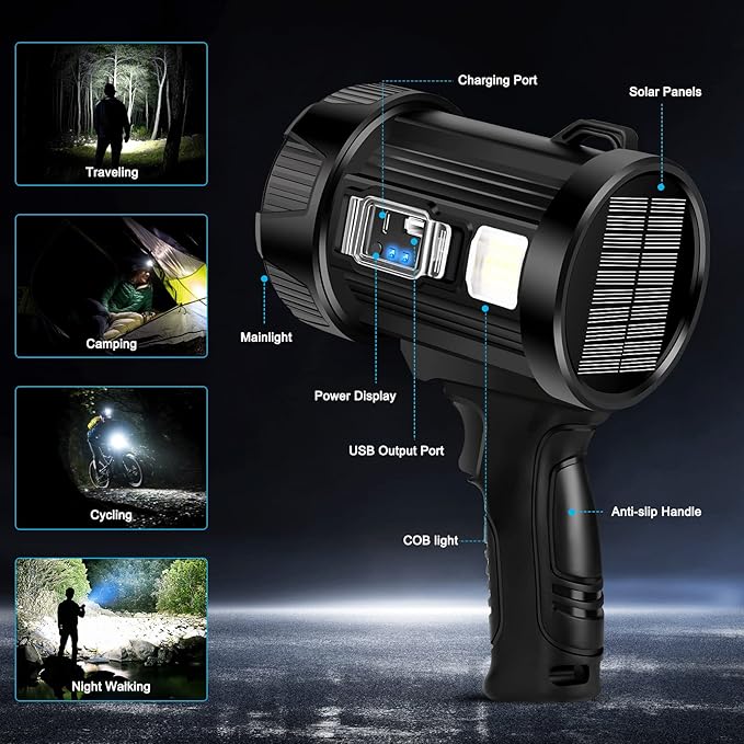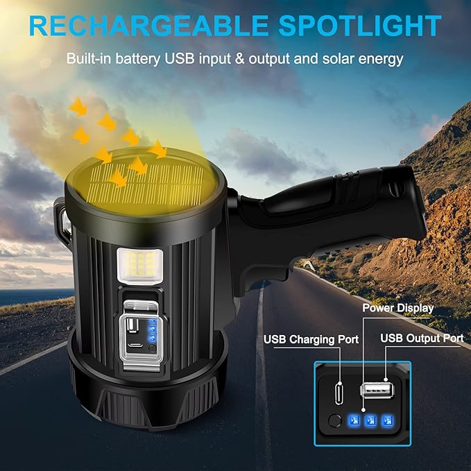 GRC Rechargeable Spotlight, 90000 Lumens Super Bright Handheld Spotlight Flashlight with Solar Panels, Led Spot Lights for Outdoor,Hunting,Camping,Boating