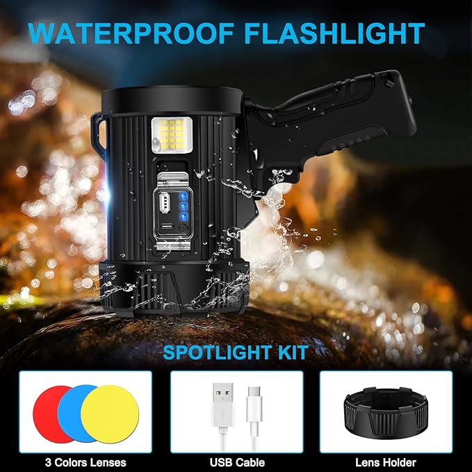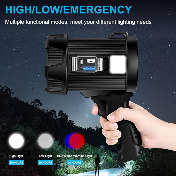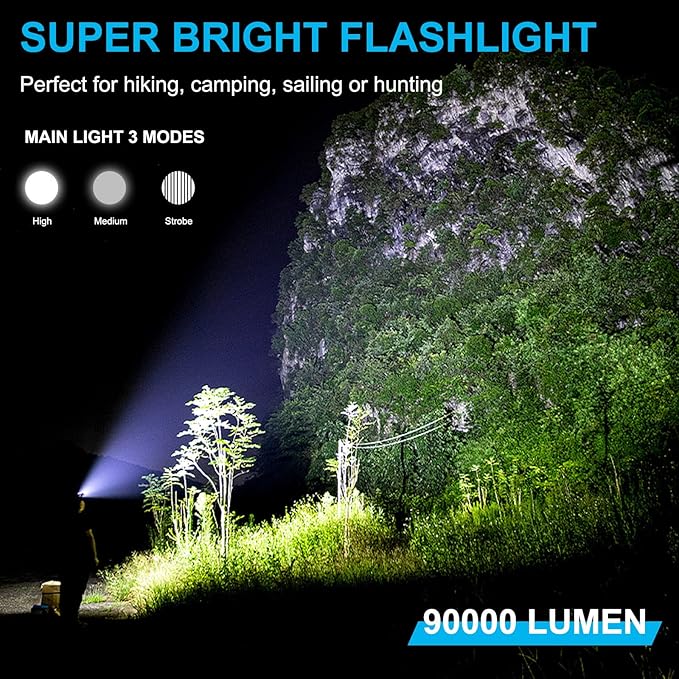 - 【Super Bright Flashlight】Embedded upgraded LED chip with a maximum output of 90,000 lumens, this spotlight flashlight can reach a maximum illumination distance of 2625 feet (800 meters), perfect for hiking, camping, sailing or hunting