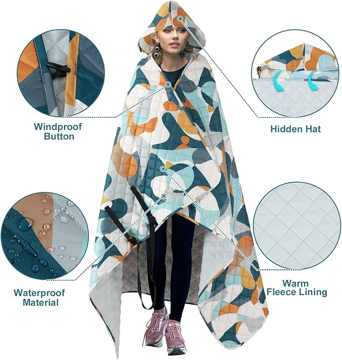 - 【HOODED DESIGN】This waterproof blanket has a hood that can be stuffed into the blanket. When it begins to rain, you can use it as a raincoat. Just put on a hood to cover your whole body and free your hands to deal with your troubles. When it doesn't rain, it can be laid on the grass as a picnic mat, which can accommodate 3-4 adults