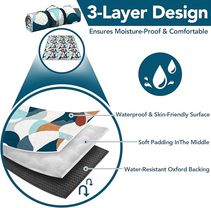 - ✅【Durable 3-Layer Design】Constructed with 3 layers, sturdy & skin-friendly polyester on top, soft padding in the middle and waterproof Oxford on backing. Thicker design along with 4 corner pockets (can be filled with sand or rocks) will keep our picnic mat grounded against wind, which also offers you extra sitting comfort, unlike other thin beach blankets.