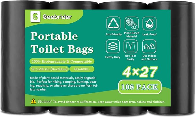 - 108 Portable Toilet Bags🚽: There are 108 toilet bags inside, divided into 4 rolls, each roll has 27, enough to meet your needs. Portable potty bags are composed of natural corn plant starch, which is biodegradable and compostable and can be internally decomposed into the soil in 45-180 days, making them safe and environmentally friendly to use.