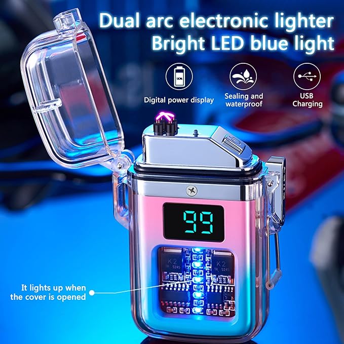 - ✅【High Quality & Multi-function】This lighter is designed for high efficiency plasma dual arc ignition.The lighter shell is made of high quality zinc alloy material.The strong zinc alloy case makes the lighter resistant to fall and wear, making it more durable to use.Lighter smart lighter chip technology LED blue light display design,looks cool and has texture.Rechargeable electronic lighter can be used repeatedly only by charging,greatly reducing the waste of waste resources and pollution.