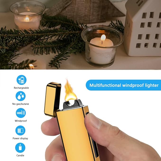 Electric Candle Lighter USB Rechargeable Lighter Plasma Arc Lighter High Power Unique Cool Lighter with Metal Ice Touch, Big Flame Grill Lighter for Outdoor Grill, BBQ, Cooking (Gold)