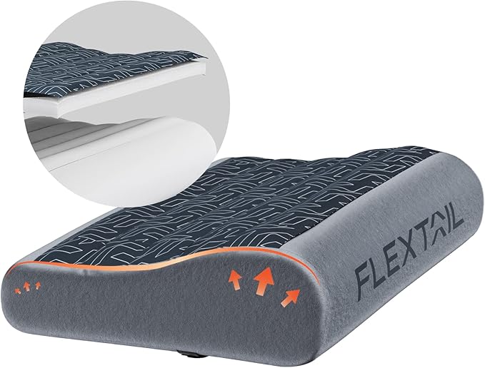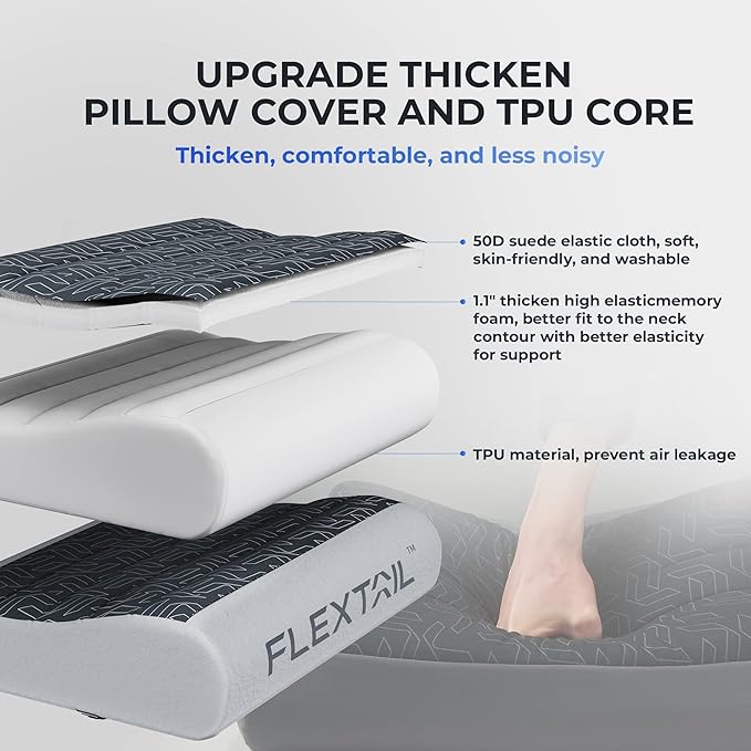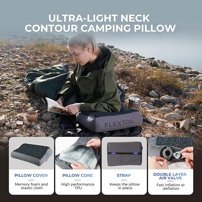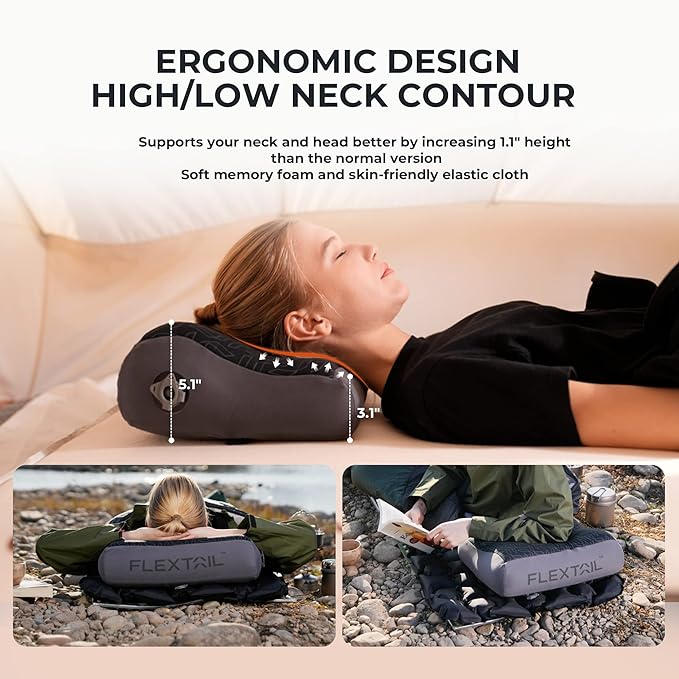 FLEXTAILGEAR Inflatable Camping Pillow Ergonomic Thicken Design, Portable Neck Cervical Travel Pillow Backpacking Gear with Washable Cover for Camping, Hiking, Airplane, Road Trip, Office