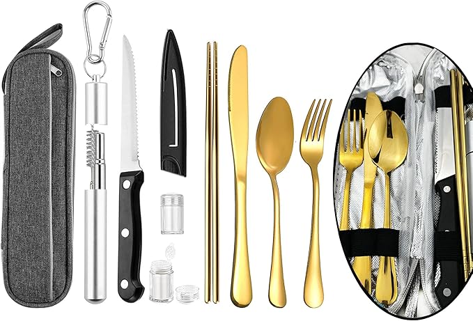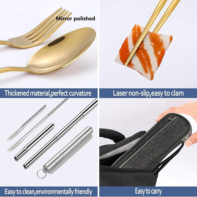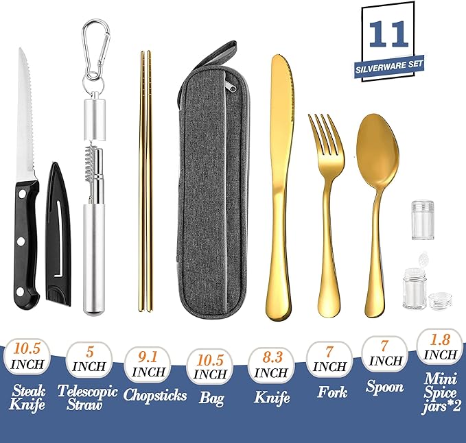 - 《Multi-function combination》Travel Gold Silverware set with case- includes knife,a special included sheathed steak knife,fork,spoon with travel chopsticks, easy-carry zipper-bag.two mini spice jars and a portable straw set ( a telescopic straw and a telescopic straw brush.)