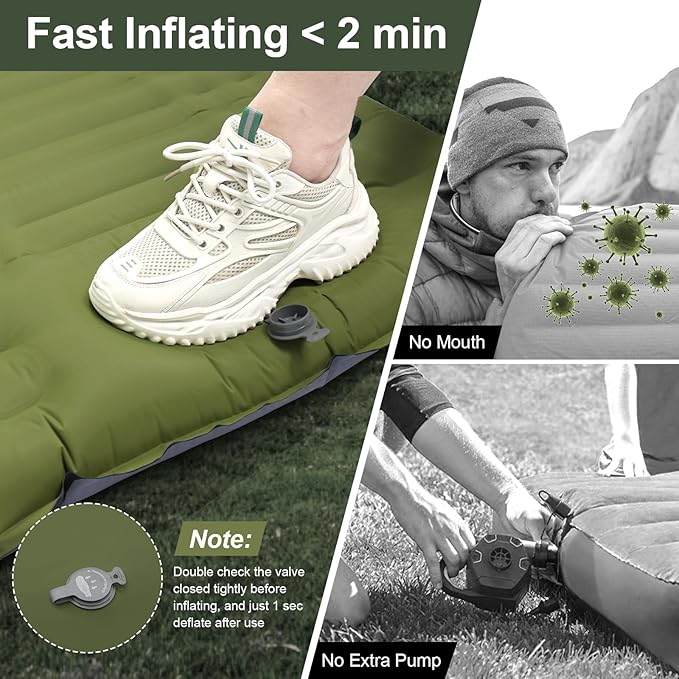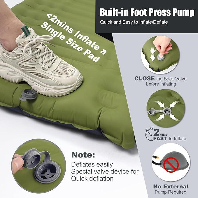 - 【Easy to Inflate/Deflate】- No need to use your mouth, hands or carry a pump to Inflating anymore, just step on the air intake device at the bottom of the sleeping pad to inflate in just 50 seconds. Each camping sleeping pad comes with 2 valves, one for easy inflation with your feet or hands and the other for quick Inflable and deflation.
