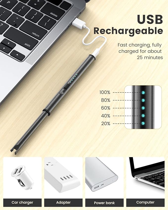 - 【USB Rechargeable Lighter】 Fast charging. The USB Lighter is rechargeable and comes with 1 USB charging cable. Also compatible with other USB micro cables. Quick charge your lighter to 100% in just 25mins. Perfect candle accessories